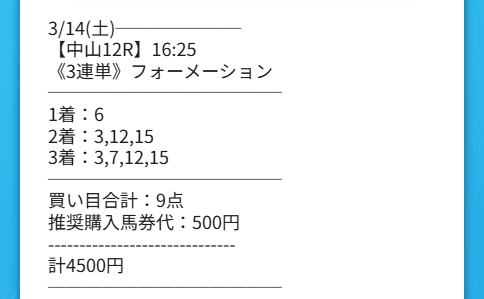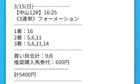 馬券って、点数を絞った上でどこに穴を置くかでセンスが出ると思ってます。だから今回の天帝の慧眼はかなり印象に残りました。中山12Rで1着16番が3番人気、2着11番が10番人気、3着5番が7番人気。この並びを9点で取ってくるなら、ただ人気順に並べた買い目じゃないのは明らかです。私は自分でもある程度見ますが、こういう2列目に10番人気を置ける情報は簡単に出せない。600円で乗って73万5900円まで届いたのは、買い目の構成そのものがうまかったからだと思っています。