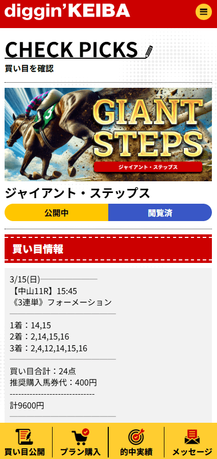 普段は仕事終わりに結果を見るくらいなので、正直そこまで競馬は詳しくないです。でもジャイアント・ステップスはすごかったです。中山11Rで1着15番が8番人気、2着2番が2番人気、3着14番が7番人気。こういう並びって、人気馬から買ってるだけじゃ絶対に取れないですよね。24点で1点400円なら自分でもまだ乗りやすい範囲でしたし、それで68万3480円なら文句ないです。自分みたいなライト層でも「この買い目は強いな」と感じられる内容でした。