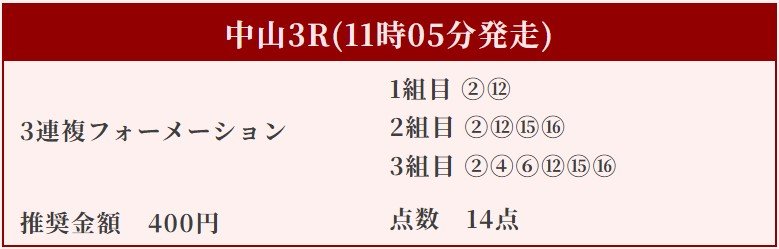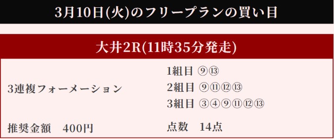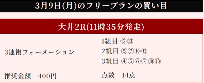 あと1頭どうしようか迷っていた時にこの予想サイトの無料予想3組目を全部拾ってみようという事で2頭軸流しの相手4頭の買い目点数4点の三連複を購入