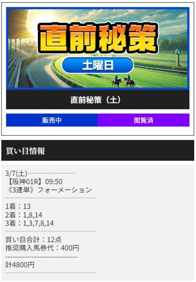 3月7日(土)の阪神1Rで10番人気を2着3着で拾って見事的中