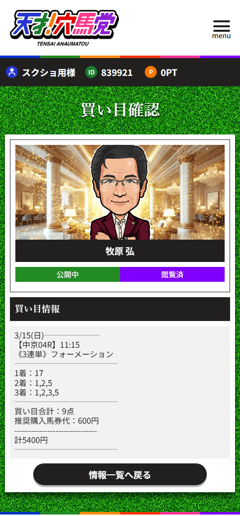 こういう“先生系”の情報って、正直当たる時と外れる時の差が大きい印象がありました。でも今回の牧原 弘は良い意味で裏切られました。中京4Rで1着17番が3番人気、2着2番が2番人気、3着5番が7番人気。軸はそこまで奇をてらわず、でも3着に7番人気を残して配当を作っているのがうまいです。9点で600円なら乗りやすいですし、それで30万6240円なら十分納得できる内容でした。変に煽る感じより、結果で見せてくれる方が信頼できます。