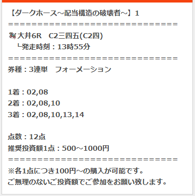 名前負けしてなかった。大井6R、2→8→10で8番人気→1番人気→2番人気。しかもこれで125万7500円。1番人気を勝たせるんじゃなくて、8番人気を頭固定で抜いてくるのが強烈でした。こういう“配当の作り方を分かってる買い目”はかなり好きです。